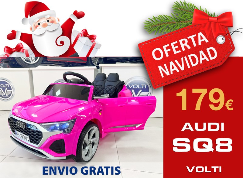 AUDI SQ8 2 MOTORES TRACCIÓN TRASERA, con dos ruedas de goma caucho motrices, Bateria de 12 voltios 4.5 AH. RUEDINES y asidedero para su fácil transporte. Asiento tapizado para mayor confor con cinturón de 5 puntos...