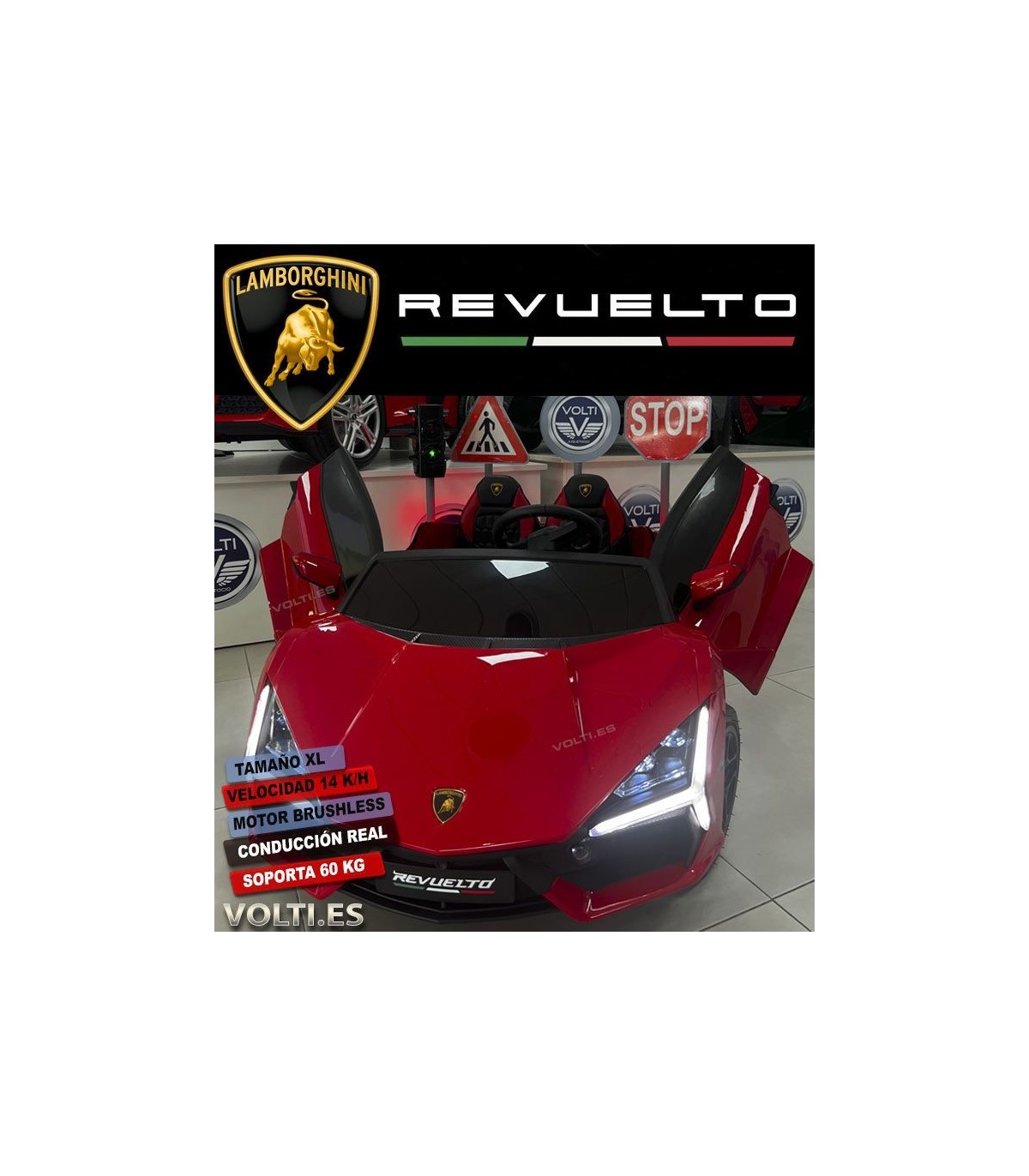 COCHE PARA NIÑO LAMBORGHINI REVUELTO PARA NIÑOS BIPLAZA TALLA XL, CONDUCCION REAL 24 V MOTOR ELECTRICO BRUSHLESS SILENCIOSO, CARROCERIA PINTADA A PISTOLA PARA UNA SENSACION MAS REALISTA, ASIENTOS TAPIZADOS, ESTE COCHE CORRE CASI EL DOBLE QUE EL PROMEDIO DE COCHES PARA NIÑOS DEL MERCADO, VELOCIDAD DE 10 A 14 KILOMETROS HORA. COCHE SIN MANDO RC.