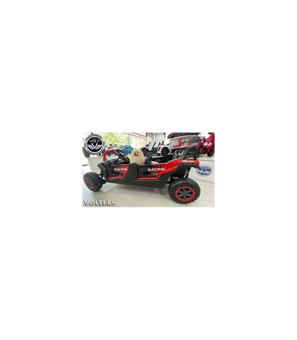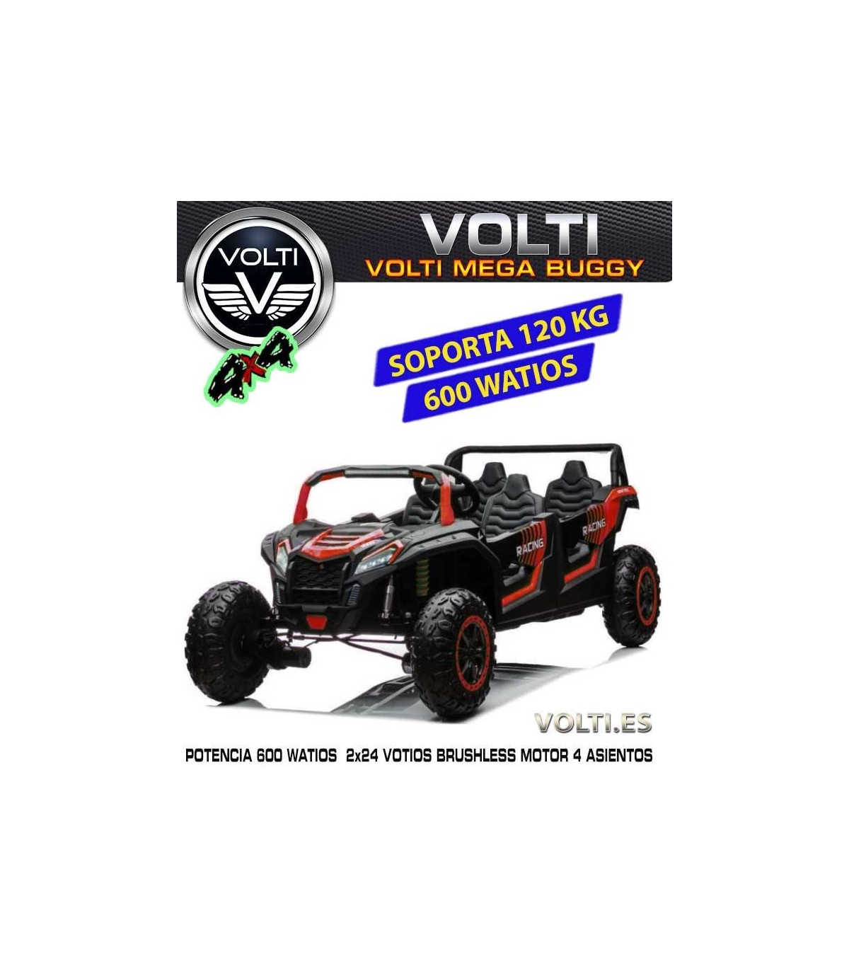 BUGGY PARA NIÑOS BATERIA 24V. 14 Ah. POTENCIA 600 WATIOS TAMAÑO XXXL 4 PLAZAS Buggy, cada motor de 150 Watios, soporta 120 kg. 4 RUEDAS MOTRICES es 4x4 tracción a las 4 ruedas No tiene mando. (Este buggy corre a más del doble que cualquier buggy stándar)