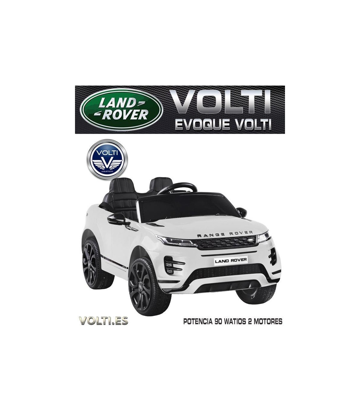 Batería una de 12V 7Ah. Arranque mediante llave. 3 velocidades: rápida y lenta.(Este coche al tener 3 velocidades, sirve para niño muy pequeño y para niño grande). Velocidad: de 3 k/h a 7 km/h. Edad: De 1 a 7 años ( Menos edad bajo la supervisión de los padres) *Dispositivo para sonido, Bluetooth, puerto Jack para conectar su dispositivo movil o un MP3, un puerto USB para conectar un Pendrive, otro puerto para tarjeta micro SD. Dispone para su fácil transporte de ruedines traseros y asidero en la parte delantera del coche. Tamaño coche: 108cm de largo, 67 cm de ancho, 51 cm alto. Peso del coche: 13,8 kg. Tamaño caja: 111 cm de largo, 59cm ancho, 36,5 cm alto. Peso de la caja: 18 kg. * Ruedas de EVA (caucho, goma). VOLTI VENDE SIEMPRE EN TODOS SU MODELOS DE COCHE RUEDAS DE GOMA CAUCHO EVA de bajo ruido) Sistema de amortiguación 1 Asiento de una plaza tapizado mullido con cinturón de 5 puntos de ajustes para mayor seguridad del niño. Medidas asiento 41cm. y medida respaldo 44cm. Capacidad de peso de carga: 35 Kg. Tiempo de ejecución: +-1 hora de uso continuo. Función Control Remoto: adelante, atrás, izquierda y derecha Luces delanteras, Luces traseras.. Sonidos música en el volante. Acelerador progresivo en el Pedal y en el Control Remoto Frenado automático y frenado manual con pedal de freno. También frenado y botón de emergencia desde el mando tanto en modo radiocontrol como conducción manual. Certificación: RoHS, CE, EN71, ISO, EN62115, Aprobado por la CE. Licencia LAND ROVER EVOQUE - Licensed by LAND ROVER. El juguete se entrega parcialmente montado. 3 años de garantía contra defecto de fabricación. *SERVICIO TÉCNICO TALLER DE REPARACIONES, Servicio Postventa, piezas de repuestos, asistencia/resolución de averías, soporte telefónico para averías, venta de repuestos, consumibles de todos los modelos y marcas. (Contacta con nosotros). Decoración de productos y especificaciones del fabricante están sujetas a cambios sin previo aviso.