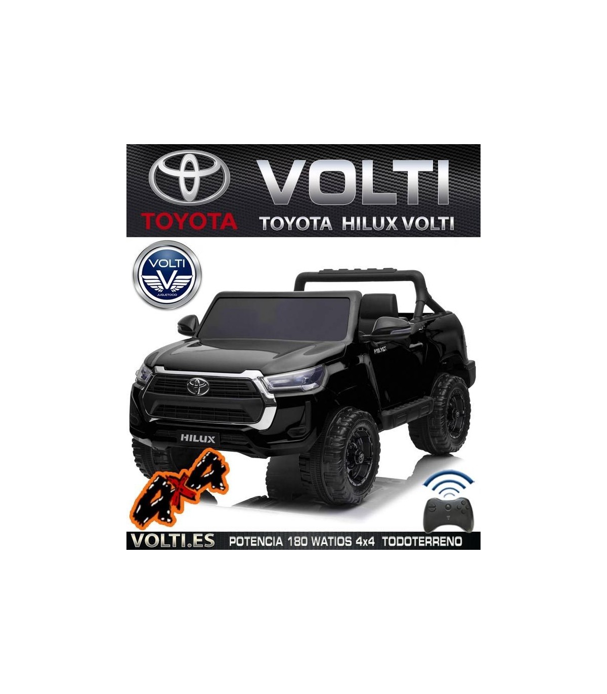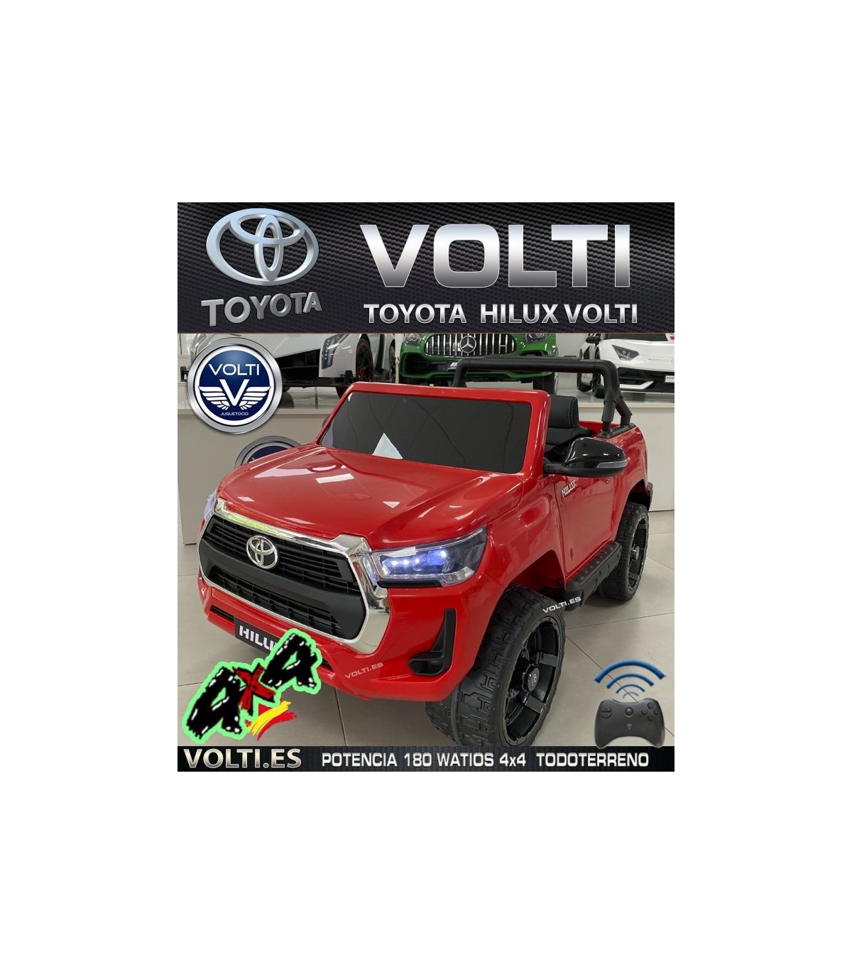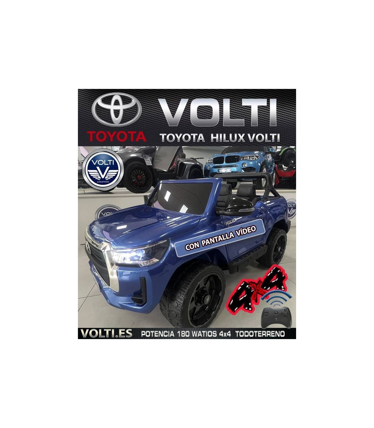 LA PICKUP TOYOTA HILUX 180 WATIOS POTENCIA, 4 SUPER CON PANTALLA VIDEO. . Funciona de dos formas, manual y teledirigido por padres. TOYOTA HILUX 4X4 VERSIÓN SUPERIOR, 4X4 TRACCIÓN TOTAL A LAS 4 RUEDAS Asientos tapizados polipiel con cinturón de cinco puntos de ajuste. Ruedas de caucho (EVA). LLaves de contacto para arrancar. Edad: De 1 a 8 años BATTERY PACK-Batería grande de 12 Voltios 14 Amperios. VENTAJAS BATTERY PACK una de las cosas más destacable además de cuatro motores o tracción total, es que su batería de 12V 14 Ah, van en sistema de Battery pack dentro de un maletín se puede cargar lejos y fuera del coche. Vendemos battery pack para más tiempo de juego, para que el niño/a no tenga que esperar a que se recargue el coche y así poder seguir conduciendo más tiempo. Consulta con nuestro taller para la compra de baterías adicionales. WhatsApp taller 690017461 Un auténtico todoterreno opera en modo 4x4 (Mayor potencia y velocidad). Dispone de interruptor para funcionar en 2x2 con los motores traseros. Dispositivo MP4 pantalla de video,puerto Jack, un puerto USB, BLUETOOTH.. Velocidad de 3 a 8 Km/h. Asiento tapizado en piel vegana de dos plazas con cinturón de cinco puntos de ajuste. Suspensión trasera. Dos puertas con apertura y cierre, Portón trasero abatible, maletero debajo del capó. Luces delanteras, luces traseras. 4 SUPER poderosas ruedas gigantes de goma EVA. (Caucho). Acelerador de pie, frenado automático al soltar el pedal de acelerador. Capacidad aprox. soporta 50 kg. Sistema para fácil transporte. Tiempo de ejecución +- 1 hora de uso continuo. Tamaño aprox. vehículo: 135cm. largo x 85cm. ancho x 74 cm. altura. Peso aprox. TOYOTA HILUX 30 kg. Tamaño aprox. caja: 139 cm. x 75 cm. x 51 cm. Peso aprox. caja: 36 kg. El juguete se entrega parcialmente montado (Fácil y sencillo armarlo). Licencia Oficial TOYOTA.Certificación: RoHS, CE, EN71, ISO, EN62115, Aprobado por CE. VOLTI VENDE SIEMPRE EN TODOS SU MODELOS, COCHES CON RUEDAS DE GOMA CAUCHO EVA , mayor agarre, bajo ruido, e irrompibles, asientos tapizados, y dos o más motores de tracción, coches siempre potentes, de 12 voltios en adelante). 3 años de garantía contra defecto de fabricación. *SERVICIO TÉCNICO TALLER DE REPARACIONES, Servicio Postventa, piezas de repuestos, asistencia/resolución de averías, soporte telefónico para averías, venta de repuestos, consumibles de todos los modelos y marcas. (Contacta con nosotros). Decoración de producto y especificaciones del fabricante están sujetas a cambios sin previo aviso.