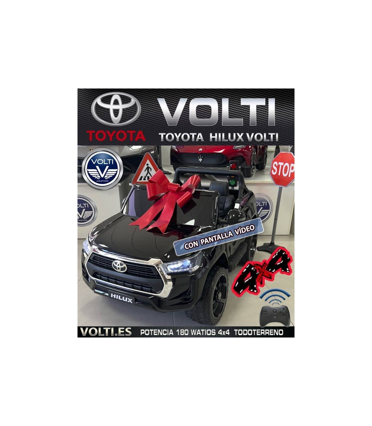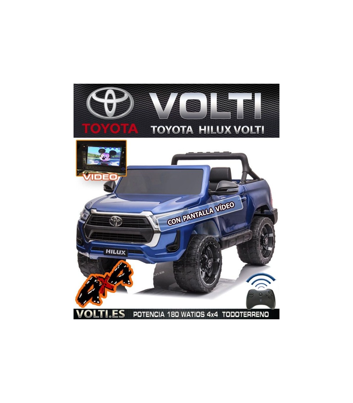 TOYOTA HILUX 4X4 POTENCIA 180 WATIOS, PICKUP, CON PANTALLA VIDEO. Funciona de dos formas, manual y teledirigido por padres. TOYOTA HILUX 4X4 VERSIÓN SUPERIOR, 4X4 TRACCIÓN TOTAL A LAS 4 RUEDAS Asientos tapizados piel vegana, con cinturón de cinco puntos de ajuste. Ruedas de caucho (EVA). LLaves de contacto para arrancar. Edad: De 1 a 8 años BATTERY PACK-Batería grande de 12 Voltios 14 Amperios. VENTAJAS BATTERY PACK una de las cosas más destacable además de cuatro motores o tracción total, es que su batería de 12V 14 Ah, van en sistema de Battery pack dentro de un maletín se puede cargar lejos y fuera del coche. Vendemos battery pack para más tiempo de juego, para que el niño/a no tenga que esperar a que se recargue el coche y así poder seguir conduciendo más tiempo. Consulta con nuestro taller para la compra de baterías adicionales. WhatsApp taller 690017461 Un auténtico todoterreno opera en modo 4x4 (Mayor potencia y velocidad). Dispone de interruptor para funcionar en 2x2 con los motores traseros. Dispositivo MP4 pantalla de video,puerto Jack, un puerto USB, BLUETOOTH. Velocidad de 3 a 8 Km/h. Asiento tapizado de dos plazas con cinturón de cinco puntos de ajuste. Dos puertas con apertura y cierre, Portón trasero abatible, maletero debajo del capó. Luces delanteras, luces traseras. 4 SUPER poderosas ruedas gigantes de goma EVA. (Caucho). Suspensión trasera. Acelerador de pie, frenado automático al soltar el pedal de acelerador. Capacidad aprox. soporta 50 kg. Sistema para fácil transporte. Tiempo de ejecución +- 1 hora de uso continuo. Tamaño aprox. vehículo: 135cm. largo x 85cm. ancho x 74 cm. altura. Peso aprox. TOYOTA HILUX 30 kg. Tamaño aprox. caja: 139 cm. x 75 cm. x 51 cm. Peso aprox. caja: 36 kg. El juguete se entrega parcialmente montado (Fácil y sencillo armarlo). Licencia Oficial TOYOTA.Certificación: RoHS, CE, EN71, ISO, EN62115, Aprobado por CE. VOLTI VENDE SIEMPRE EN TODOS SU MODELOS, COCHES CON RUEDAS DE GOMA CAUCHO EVA , mayor agarre, bajo ruido, e irrompibles, asientos tapizados, y dos o más motores de tracción, coches siempre potentes, de 12 voltios en adelante). 3 años de garantía contra defecto de fabricación. *SERVICIO TÉCNICO TALLER DE REPARACIONES, Servicio Postventa, piezas de repuestos, asistencia/resolución de averías, soporte telefónico para averías, venta de repuestos, consumibles de todos los modelos y marcas. (Contacta con nosotros). Decoración de producto y especificaciones del fabricante están sujetas a cambios sin previo aviso.