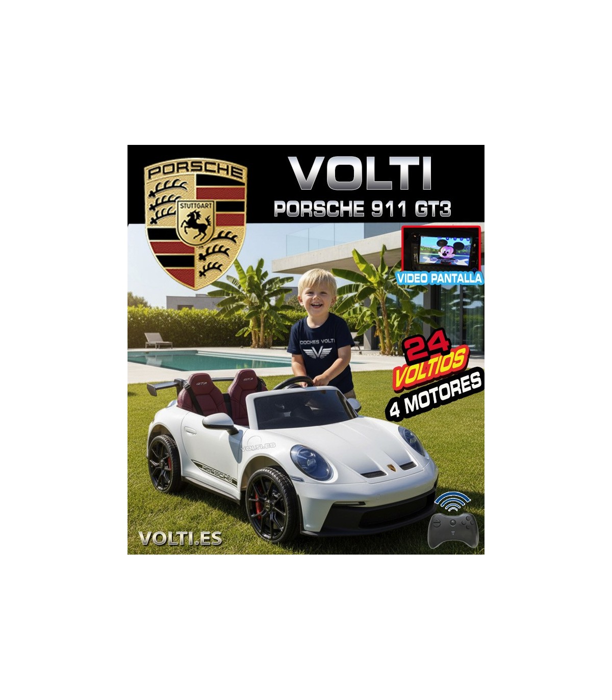 PORSCHE 911 GT3 PARA NIÑOS BIPLAZA CON PANTALLA VIDEO 4 MOTORES CON MANDO RADIOCONTROL, 4 MOTORES, TRACCIÓN TOTAL A LAS CUATRO RUEDAS, POTENCIA 800 WATIOS Y EQUIPADO CON PANTALLA VIDEO.