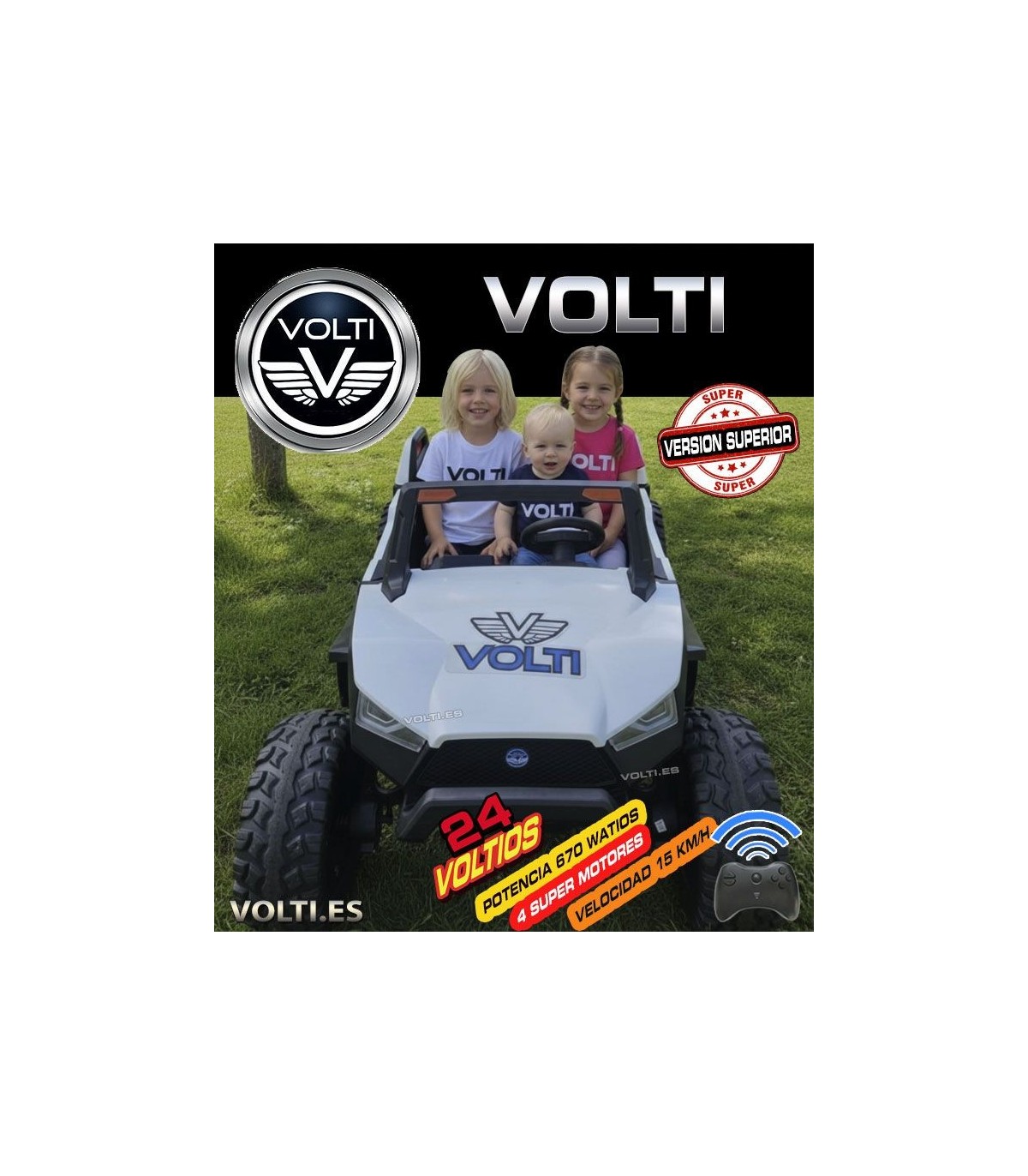 3 años de garantía contra defecto de fabricación.VOLTI VENDE SIEMPRE EN TODOS SU MODELOS, COCHES CON RUEDAS DE GOMA CAUCHO EVA , mayor agarre, bajo ruido, e irrompibles, asientos tapizados, y dos o más motores de tracción, coches siempre potentes, de 12 voltios en adelante).