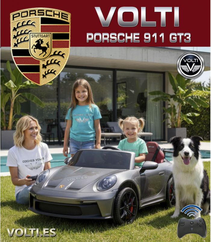 PORSCHE 911 GT3 PARA NIÑOS MOTOR BRUSHLESS BIPLAZAEDICIÓN LIMITADA, PANTALLA VIDEO MP4. CARROCERIA PINTADA PARA UNA SENSACIÓN MAS REALISTA. Batería recargable EXTRAIBLE BATTERY PACK de 24 VOLTIOS 7 AH BATERY PACK PARA CARGAR COMODAMENTE FUERA Y LEJOS DEL COCHE. Dispone de otro compartimento para llevar otra batería para prolongar tiempo de juego, ( El coche trae una unidad de bateria o battery pack) Si deseas tener otra de repuesto para prolongar tiempo de juego y evitar largas esperas de recargas, puedes comprarla con nosotros, consulta a nuestro personal de SERVICIO TÉCNICO/REPUESTO EN EL WHATSAPP 690017461 o 916591677. SUPER MOTOR BRUSHLESS MAS EFICIENCIA, VELOCIDAD Y SEMI-SILENCIOSOS. RUEDAS DE AIRE MATERIAL CAUCHO. FRENO DE MANO PARA UNA CONDUCCIÓN MÁS DIVERTIDA Y SEGURA. Con MP4 Player pantalla vídeo LCD táctil, (El coche tiene sistema reproductor para música y videos con un puerto USB y puede conectarse un pendrive. Lector de tarjeta micro SD , Bluetooth y radio FM. Coche de dos plazas, asientos tapizados con piel vegana y cinturones. Alfombrillas Porsche para los pies. Velocidad: de 3 k/h a 15 km/h. Capacidad de peso de carga: 60 Kg. Edad: De 3 a 12 años Peso del coche aprox.: 47 kg. Tamaño coche aprox.: 148 cm largo, 90 cm ancho, 56 cm alto. Tamaño caja aprox.:: 150 cm largo, 80 cm ancho, 38 cm alto. Peso de la aprox.: 50 kg. Ruedas de caucho goma Eva. Sistema de amortiguación. Tiempo de ejecución: +- 1:30 hora de uso continuo. (Depende de el peso al que se le son eta y tipo de suelo las irregularidades del terreno) Luces delanteras, traseras. Claxon en el volante. Acelerador progresivo en el Pedal y en el Control Remoto Frenado automático y frenado manual con pedal de freno. También frenado y botón de emergencia desde el mando tanto en modo radiocontrol como conducción manual. Certificación: RoHS, CE, EN71, ISO, EN62115. Aprobado por la CE. Licencia PORSCHE PARA NIÑOS - Licensed by PORSCHE.El juguete se entrega parcialmente montado. (Fácil y sencillo armarlo). 3 años de garantía contra defecto de fabricación.VOLTI VENDE SIEMPRE EN TODOS SU MODELOS, COCHES CON RUEDAS DE GOMA CAUCHO EVA , mayor agarre, bajo ruido, e irrompibles, asientos tapizados, y dos o más motores de tracción, coches siempre potentes, de 12 voltios en adelante. SERVICIO TÉCNICO TALLER DE REPARACIONES, Servicio Postventa, piezas de repuestos, asistencia/resolución de averías, soporte telefónico para averías, venta de repuestos, consumibles de todos los modelos y marcas. (Contacta con nosotros). Decoración de productos y especificaciones del fabricante están sujetas a cambios sin previo aviso.